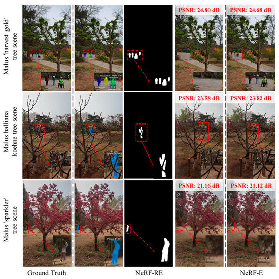 As shown in Figure 3, the number of images did not significantly affect the NeRF-RE model’s reconstruction of the unbounded begonia tree scene. The Mip-NeRF 360 model requires dense viewpoints and multi-angle camera poses to achieve high-fidelity scene rendering, which may stem from limitations inherent in the original NeRF architecture [23,24,25,26]. However, insufficient input images lead to inadequate feature extraction in Mip-NeRF 360. This manifests visually as object floating and background blurring artifacts in the rendered results (Figure 5). Notably, training the Mip-NeRF 360 model with 60 images of the malus ‘sparkler’ tree resulted in a rendered output with PSNR, LPIPS, and SSIM values of 16.67 dB, 0.59, and 0.22, respectively, which were found to be unsuitable for real-world applications. Conversely, the number of images had little impact on the NeRF-RE model’s reconstruction and rendering of three types of crabapple tree scenes with varying levels of complexity. This improvement may stem from the integration of an identification and segmentation model [19,20,21,22] in NeRF-RE, which enables precise extraction and segmentation of target features within scenes, effectively enhancing the model’s capability to extract image feature information (Table 2). Furthermore, the object removal and inpainting module reduces the presence of irrelevant scene elements, thereby decreasing the complexity of scene reconstruction. Finally, the multi-resolution hash grid and proposal network establish a feature pyramid network [22] with similar multi-scale characteristics. This pyramid architecture efficiently captures cross-scale contextual information, improves the model’s training efficiency [27], and significantly enhances its capacity to localize and represent tree features within scenes. Relative to the Mip-NeRF 360 model, the NeRF-RE model demonstrates markedly superior rendering performance under data-limited conditions. This outcome underscores the enhanced practicability and robustness of the NeRF-RE model.