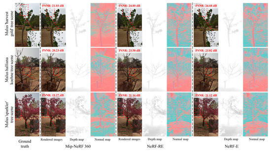 As depicted in Figure 5, the NeRF-RE model demonstrated superior rendering performance compared to the Mip-NeRF 360 model across three types of crabapple tree scenes. The Mip-NeRF 360 model’s rendering of the malus halliana koehne tree scene exhibited significant tree branch damage. In addition, the rendering of the malus ‘harvest gold’ tree and malus ‘sparkler’ tree scenes in the Mip-NeRF 360 model featured small areas of broken branches, leaves, and petals, and blurred rendering issues. In contrast, the NeRF-RE model maintained stable, high-definition performance across the three crabapple tree scenes, with no damage observed to the branches and leaves. In the normal map results, the Mip-NeRF 360 model over-emphasized the simulation of the surrounding environment of the crabapple trees, particularly in the scenes of the malus halliana koehne and the malus ‘harvest gold’ trees, whereas the NeRF-RE model concentrated more on simulating the details of the crabapple trees themselves.