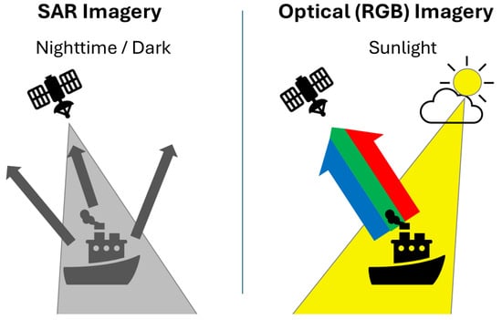 Figure 1 illustrates how SAR and optical imagery may be achieved through satellites during daylight and nighttime or under dark or unclear visual conditions. SAR uses radio waves, which can penetrate through clouds and operate both during the day and night. This makes SAR ideal for consistent ship detection under all weather and lighting conditions. On the other hand, optical imagery (RGB) relies on sunlight and visible spectrum. It provides high-resolution, colour images, but performance drops in cloudy or nighttime conditions.