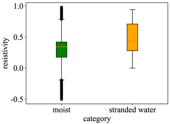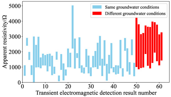The above process allows for the analysis of data from different construction faces, more clearly identifying the distribution differences among data categories. This paper conducts a correlational analysis of the apparent resistivity data in front of the tunnel face for construction faces categorized as dry, moist, line flow, and sheet flow, analyzing the patterns of different categories of construction faces and the actual groundwater conditions in corresponding detection sections to preliminarily judge the applicability of data from different categories. There are cases in the detection conclusions where the groundwater conditions within the detection section are the same as those at the construction face. For this, detection data that meet this criterion and data that do not are extracted, and the pattern of data distribution is analyzed, with results shown in Figure 2.