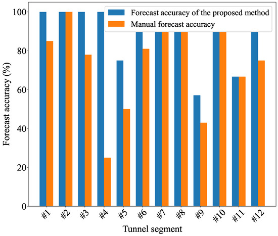 Figure 5 compares the accuracy results of the proposed method and expert predictions in forecasting groundwater conditions. The twelve segments represent deep-buried tunnel sections surveyed by the transient electromagnetic (TEM) method, each with a fixed detection window of 60 m along the tunnel axis. As summarized in Table 1, Segments 1–3 are located in gneiss, Segment 4 in quartzite, and Segments 5–12 in diorite, offering a spread of lithological conditions.It can be seen that the proposed method surpasses the accuracy of manual predictions across multiple tunnel groundwater conditions.