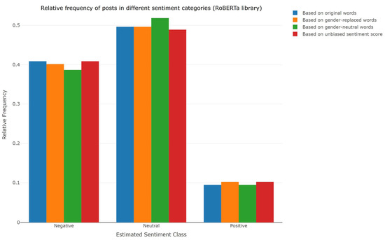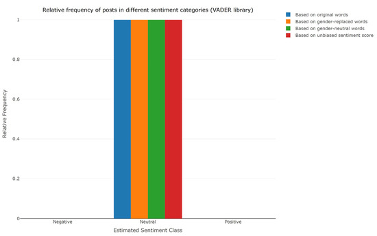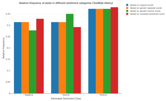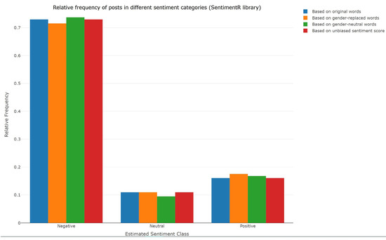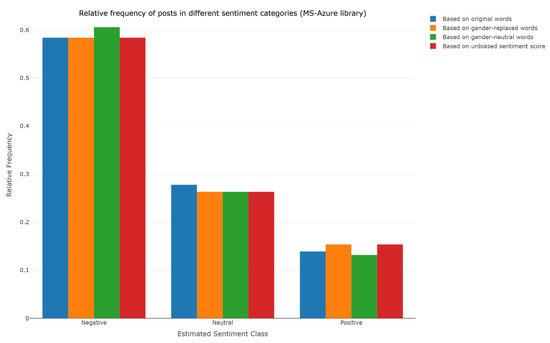 - The gender-unbiased sentiment score and sentiment probabilities are formulated as follows:where is the estimated gender-unbiased sentiment score, and are estimated gender-unbiased sentiment class probabilities. The probability distribution represents how much the estimated sentiments from three sentences, , and , are relatively closer to reality, and . This information represents the existing knowledge (either from experts or previous analyses in the same topic). In case such information is not available, the uninformative probability can be used: .
