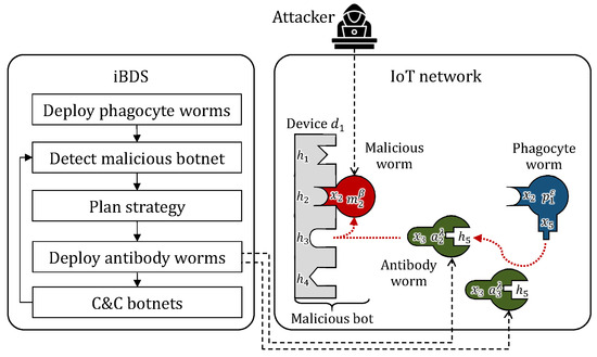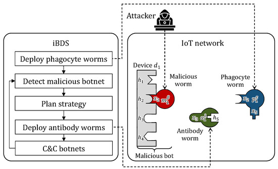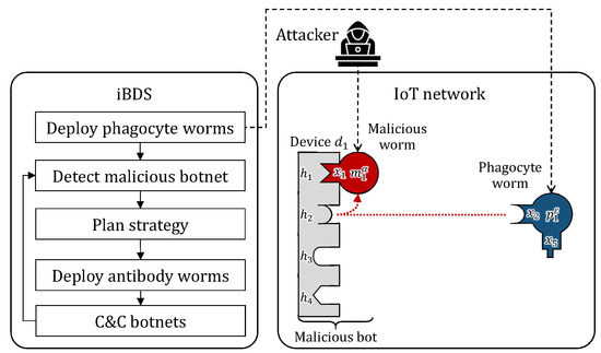 - Deploy phagocyte worms: iBDS deploys phagocyte worms on the IoT network and establishes a resident phagocyte botnet.