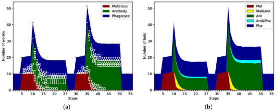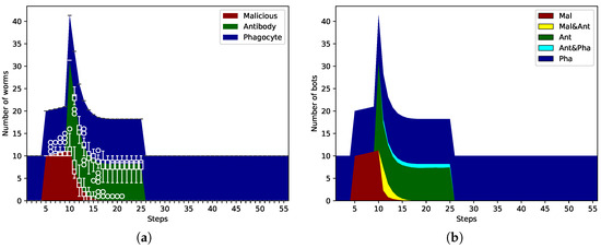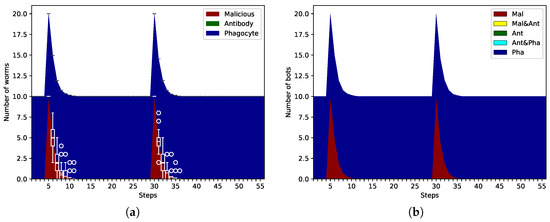 - Step 10: iBDS detects 10 () malicious bots and deploys 20 () -type antibody worms as the primary immune response.