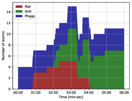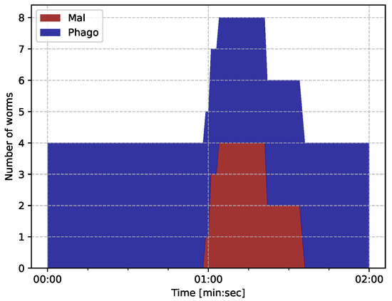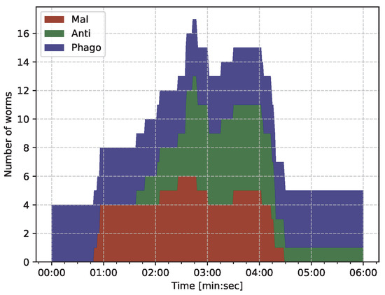 - The attacker infects the network with 4 -type malicious worms at about 01:00 (min:sec).