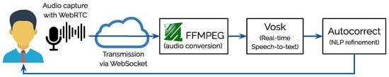 Two microservices—one for offline speech recognition and another for orthographic correction—compose the core backend. The speech recognition microservice uses the Vosk engine to infer transcriptions from audio data, while the NLP microservice processes the raw output to ensure grammatical correctness and lexical normalization. This separation of concerns adheres to microservice principles and facilitates independent scaling or upgrading of system components.