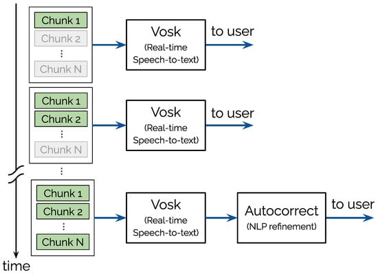 Progressive transcription pipeline: audio chunks are processed via Vosk for real-time speech-to-text conversion, with the final stage incorporating NLP-based orthographic correction for enhanced accuracy.