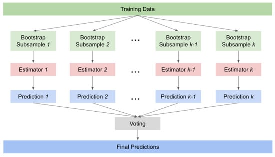 Bagging, or bootstrap aggregating, enhances model robustness by training each base model on different bootstrap samples of the training data. This diversity reduces overfitting and variance, leading to more stable predictions [23]. The aggregated prediction is typically expressed as: