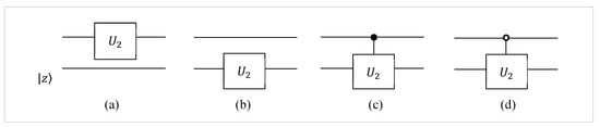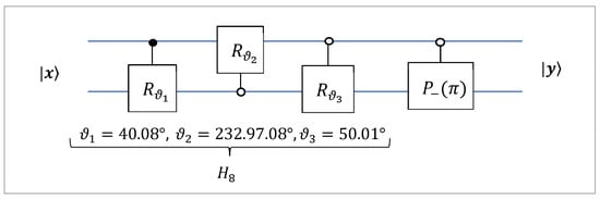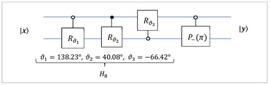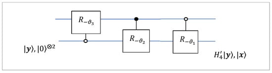 It should be noted that the quantum circuits in Examples 7 and 8 can be simplified; namely, they can be used without the last phase shift gate For this, the last rotation in DsiHT should be performed as shown in Equations (54) and (55), but with parameter instead of . Then, the angle should be changed by