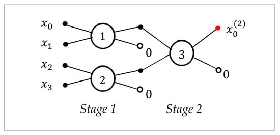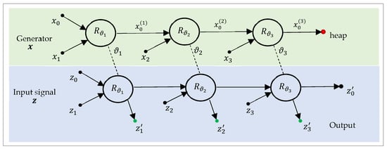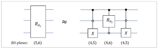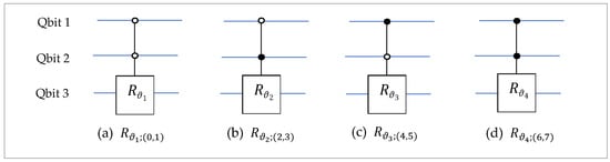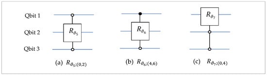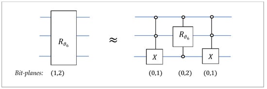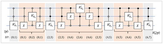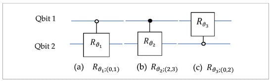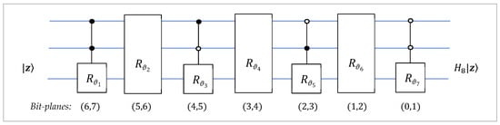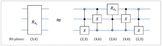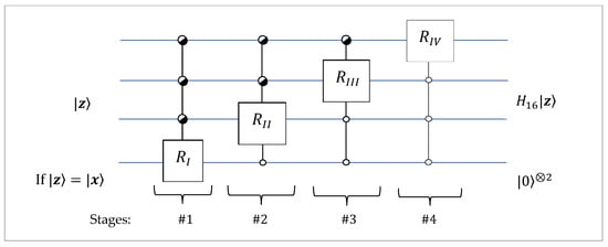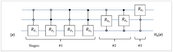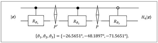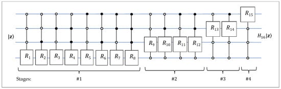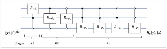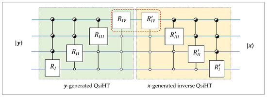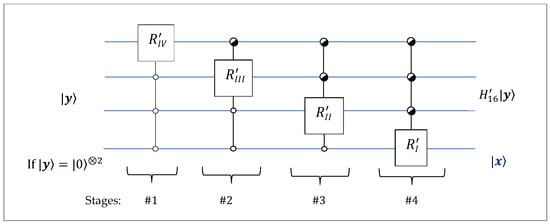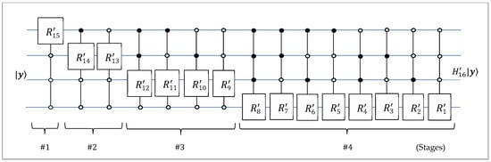 Example 6. Let be the 4-qubit superposition with real amplitudes . The 4-qubit QsiHT by this generator can be calculated by the quantum circuit given in Figure 25. Fifteen angles are used: the angles of the angular representation of the generator, To simplify the notations in this circuit, all rotations are denoted by Four stages of calculations are shown, with a total of 15 gates with three control bits. In the first stage, the eight rotation gates and the corresponding bit planes are In the second stage, four rotation gates have the last control bit 0, Two rotation gates with the last two 0 control bits are used in stage 3, and the last rotation with three 0 control bits is used in stage 4: The circuit for the inverse 4-qubit DsiHT is obtained directly from the above circuit and is shown in Figure 26. All rotations are performed in reverse order, and the notations