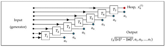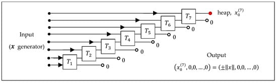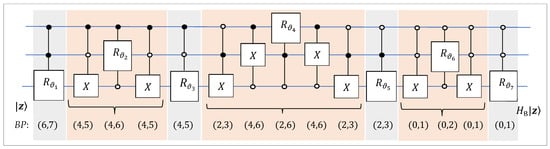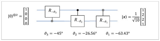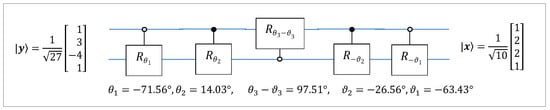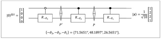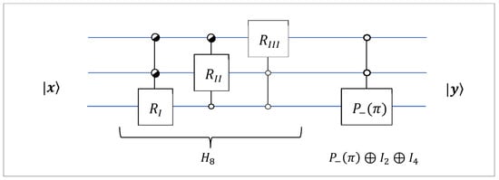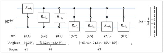 . Consider two 8-D vectors and after normalizing them by and respectively. These two vectors represent the 3-qubit superpositions and ,andOur goal is to obtain the vector from using only one eight-point DsiHT, or 3-qubit QsiHT. Therefore, the vector parameter for the eight-point DsiHT with the generator is taken to be equal to The norm of this vector is equal to . The angular representation of the vector equals The matrix of the eight-point DsiHT has 32 zero coefficients and is equal to The transform of the generator equals Here, the sign of the first component should be changed, because As in Example 5, we can use the phase shift gate with two control qubits, that is, , and reconstruct the sign of We obtain the given vector : Thus, with seven rotations plus the 0-controlled phase shift gate, the following 3-qubit transformation holds: The circuit for this transformation is shown in Figure 36. In this figure, the rotations in three stages are defined by The results of simulation of this circuit in Qiskit are shown in Table 11 and Table 12. When comparing with the known estimation for the case, we obtain the number 14. The circuit of transformation in Figure 34 includes seven elementary rotations, that is,