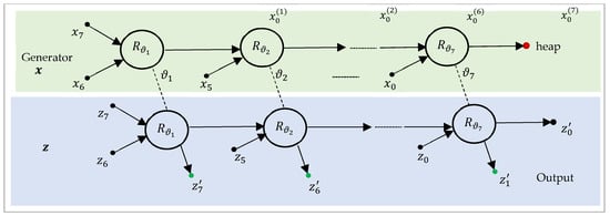 rotations are performed on the generator, and at each stage of the transformation, one of the two rotation outputs is reset to zero. For instance, the generator data can be processed in order (it is the path)