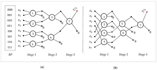 Also, in stage 2, the fifth rotation uses the inputs numbered 0 and 4, but outputs numbered 0 and 2. The sixth rotation uses the inputs numbered 2 and 6, and outputs numbered 4 and 6. These rotations are not on the same pair of adjacent bit planes. Thus, we assume that this path is not suitable for the 3-qubit QsiHT. However, there are other effective paths for the
