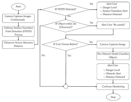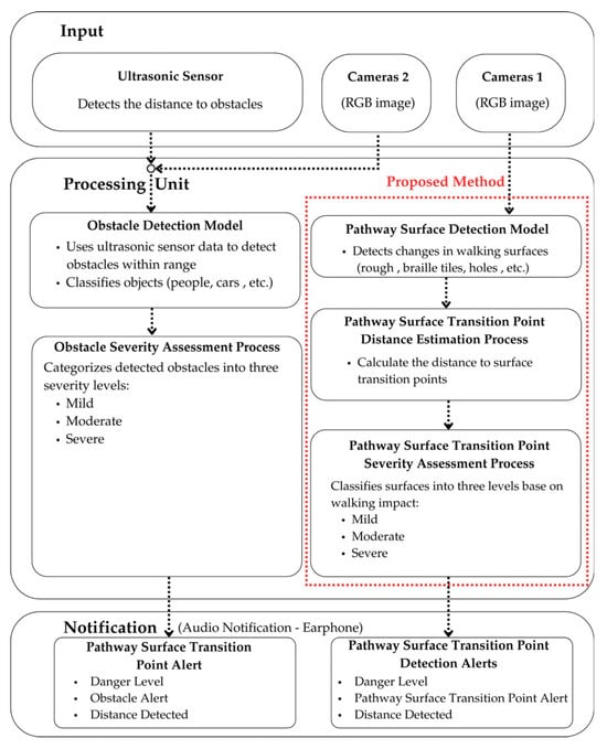 - Integration of the PSTPD method and enhanced obstacle detection, in which the proposed system introduces a smart cane that delivers distance-based alerts indicating the severity and proximity of both obstacles and pathway surface transition points.