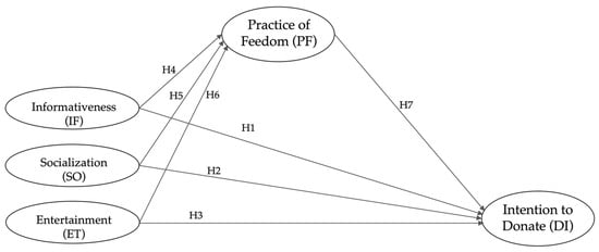Therefore, as a first reason to consider PF as a mediator, there is a causal path logic: viewers’ motivations to engage with streams (entertainment, socialization, informativeness) lead to a sense of freedom, which then enables giving behavior; in other words, freedom (in the Foucauldian sense) is an internalized cognitive and psychosocial process that translates motivations into action. Secondly, empirically, Yoganathan et al.’s study [22] shows that donating arises as a result of self-determination and self-extension within the Twitch environment. These are psychological transformations triggered by motivations but operationalized through the freedom to act. Lastly, the Foucauldian freedom operates like an explanatory bridge, that is, a transformational state rather than an external condition, for which it should conceptually play a mediator role. Thus, PF does not duplicate UGT constructs but transforms them: it answers why similar gratifications (e.g., two equally socialized viewers) yield divergent donation behaviors—the difference lies in whether motivations become ethical practices.