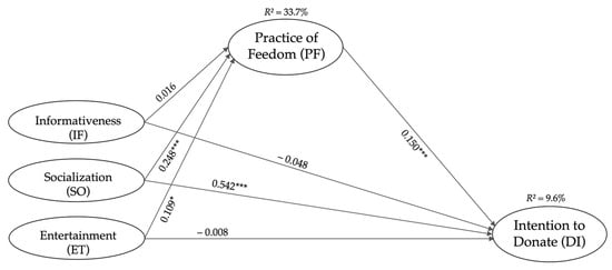 The results show that SO and PF have a significant direct effect on the intention to donate, while SO and ET have a significant effect on PF. Informativeness has no significant direct effect on SO and DI, nor entertainment on DI. Therefore, hypotheses H2, H5, H6, and H7 are supported. The results also demonstrate that practice of freedom serves as a significant partial mediator in the relationship SO and the intention to donate, confirming hypothesis H8b. The model demonstrates moderate explanatory power for PF as evidenced by R2 = 33.7%, and weak explanatory power for DI (9.6%). The absence of multicollinearity (VIF < 5) supports the robustness of the model.