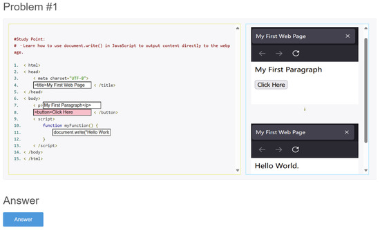 After a student enters an answer in the blank form and clicks the “Answer” button shown in Figure 1, the answer-marking program checks the correctness of the submitted answer through string matching. If the answer is wrong, the background color of the blank turns red. Conversely, if the answer is correct, the background color changes to white. Students have the flexibility of modifying and resubmitting answers as needed until they can reach correctness or giving up modifying them.