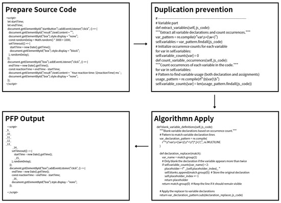 To facilitate scalable content creation, the automated algorithm for the generation of PFP instances was implemented using Python. This algorithm adopts eight general and six game-specific phrase selection rules to identify syntactically and semantically meaningful code segments from the integrated HTML, CSS, and JavaScript source code. This automatic generation mechanism reduces instructor workloads and supports the production of diverse, context-aware exercises.