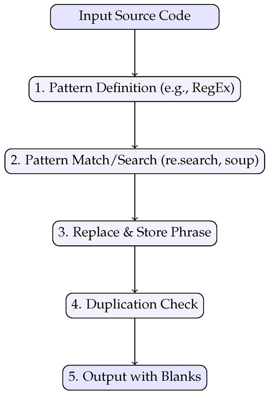 - Duplication Handling: To maintain pedagogical efficiency, the algorithm tracks previously replaced phrases (e.g., identical id values or repeated function names) and avoids creating redundant blanks. This reduces cognitive overload and improves exercise variety.