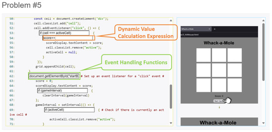 In a typical instance, dynamic responses involve interactions triggered by user actions (e.g., button clicks and form submissions), as well as real-time updates (e.g., textual content changes, style modifications, and element visibility toggles) applied to Web pages. These issues require learners to understand not only the syntax but also the underlying logic and behavior that drive such dynamic changes in client-side Web applications.