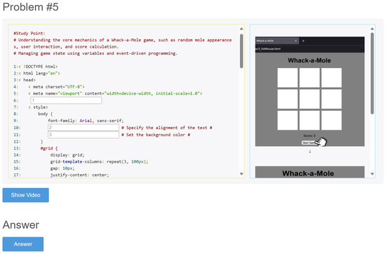 This type of the exercise problem is particularly suitable for evaluating conceptual understanding of interactive Web development and Web game logic, such as DOM manipulation, event handling, dynamic styling, and user feedback.