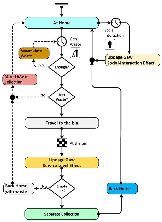 In both cases, the potential adjustment of the gaw is determined probabilistically using the green_variation function, which governs the likelihood of behavioural change based on previous experiences. Upon completion, the process concludes and the agent transitions back to the At_Home state, awaiting the next waste disposal cycle.