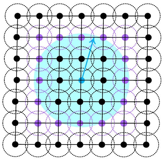 Hence, at least theoretically, the reachable set of the neighbouring nodes is made of all the 25 nodes enclosed within the purple ring. However, in the case represented in