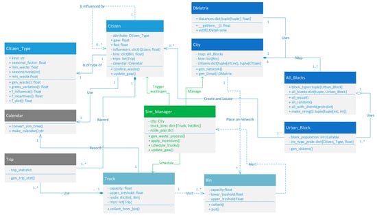 Each node is populated with a synthetic population composed of different agent types (or citizen archetypes), which are randomly positioned within a radial area cantered on the node. The definition of these archetypes involves configuring each type of citizen by assigning both static attributes (such as their initial level of gaw) and associated behavioural functions, as outlined in previous sections. For instance, a green-oriented citizen may be modelled with a high initial gaw, low probability of discouragement in response to service failures, and reduced sensitivity to negative peer influence from neighbours with unsustainable habits. The number of citizens per node, as well as their distribution across archetypes, can be explicitly defined. For instance, one might assign 50% of a node’s population to an eco-friendly type, 30% to a neutral type, and 20% to a non-eco type. Operationally, the construction of the network is carried out incrementally through a multi-layered architecture involving three key classes, namely Urban_Block, All_Blocks, and City, as detailed below.