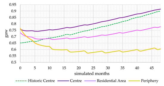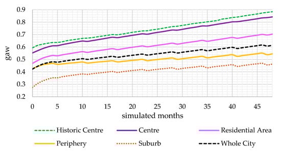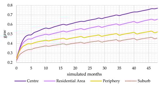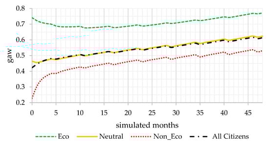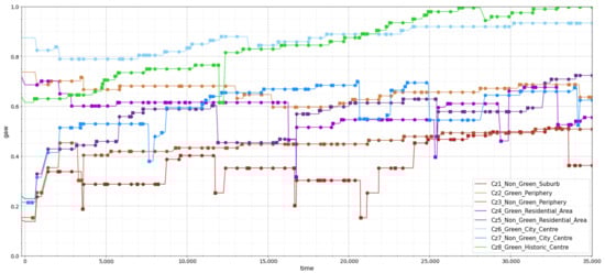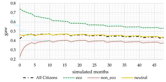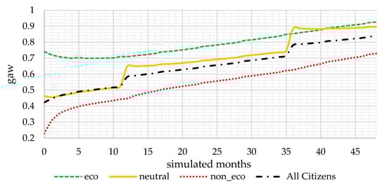 Lastly, some parameters have been deliberately kept constant over time. Each citizen’s behavioural archetype, representing their inherent disposition towards sustainability, is assumed to be a fixed trait throughout the simulation. A non-eco citizen, for instance, cannot become eco, and vice versa; what can evolve is their gaw, but not their underlying nature. Similarly, citizens are considered geographically static, remaining at their initial locations without relocating during the entire simulation period. These assumptions are realistic within a planning horizon of 1–5 years (i.e., the time frame for which the framework was developed), during which profound changes in citizens’ inherent dispositions are negligible, as are major relocations or significant alterations in the urban layout and its socio-spatial stratification. Nevertheless, it would be interesting to integrate the model with approaches that account for citizen relocation over the medium-to-long term (e.g., as a result of urban regeneration projects or the construction of social housing), as well as with mechanisms enabling dynamic transitions between archetypes.