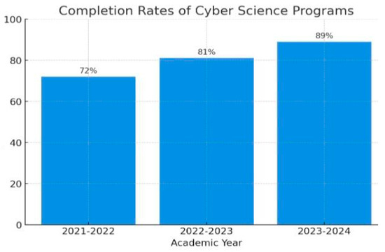 Data from completed courses showed clear signs of progress once AI-enhanced platforms were in use. Between 2022 and 2024, completion rates of cyber science programs rose from 72 to 89%, with the most significant improvements observed in online programs. Figure 2 below shows the comparison of this completion rate between 2022 and 2024 and the trend in increments.