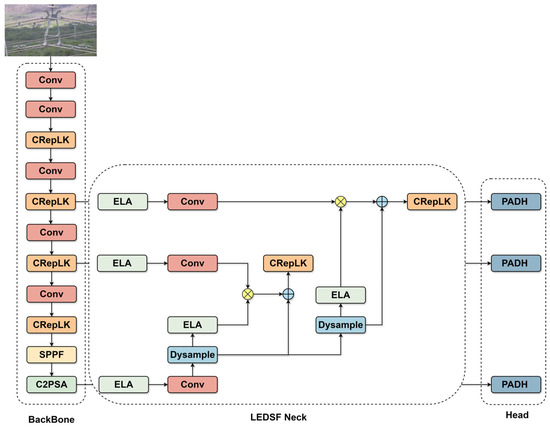 To ensure detection accuracy in power transmission line inspection while realizing a lightweight model, this study introduces a lightweight architecture based on YOLOv11. As illustrated in Figure 1, the proposed LRA-YOLO comprises a backbone, a neck, and a detection head. The backbone is primarily composed of Conv, CRepLK, SPPF, and C2PSA modules. Specifically, an input image is first processed by a sequence of two Conv layers, one CRepLK module, and another Conv layer for initial feature extraction. Subsequently, P3 and P4 feature maps are generated via alternating Conv and CRepLK modules. Finally, the P5 feature map is extracted following a sequence of Conv, CRepLK, SPPF, and C2PSA modules. These feature maps (P3, P4, and P5) are then fed into the Lightweight ELA-guided Dynamic Sampling Fusion (LEDSF) neck for multi-scale feature fusion. The resulting features are subsequently passed to the Partial Asymmetric Detection Head (PADH) for bounding box and category prediction.