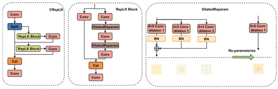 The structure of the CRepLK module is shown in Figure 2. The CSP structure [31] of the CRepLK module can integrate the gradient flow information of each branch while maintaining lightweight, remaining or even enhancing the model’s learning ability. Specifically, the input features are first processed by a convolution layer to adjust channel dimension and are subsequently split into two parts. One part undergoes processing by a RepLK Block [32] and a convolution layer. The resulting feature is then fed into an additional RepLK Block and Conv layer for multi-scale feature extraction. The three resulting features are concatenated, and their channel dimension is adjusted by a final Conv layer to match the input. The RepLK Block consists of DilatedReparam and convolution. DilatedReparam is designed to efficiently obtain a large receptive field, mitigating the substantial computational and parametric overhead associated with using large, dense convolution kernels. It consists of a primary 5 × 5 convolution branch and two parallel 3 × 3 convolution branches with dilation rates of 1 and 2, respectively. Dilated convolution expands the kernel’s receptive field without increasing its parameters or computational cost. DilatedReparam employs structural reparameterization: during training, its three branches are trained in parallel; during inference, they are fused into a single, equivalent 5 × 5 kernel, thereby significantly reducing the parameter count and computational load.