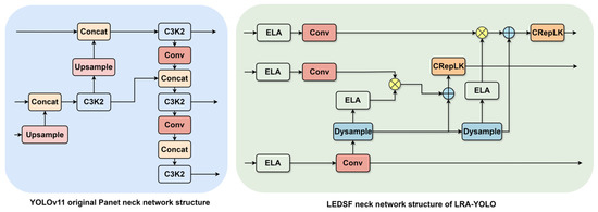 Neck network structure of YOLOv11 and LRA-YOLO. Our LEDSF neck is a lightweight alternative to Panet, enhances multi-scale feature interaction by employing ELA and Dysample to selectively fuse high-level and low-level features through a gating mechanism.