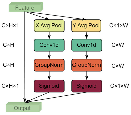 As shown in Figure 4, the ELA module aims to enhance feature representation via decoupled horizontal and vertical high-order spatial attention mechanisms. The module first utilizes adaptive average pooling to aggregate the global contextual information from the input feature maps along the height and width directions, respectively. Subsequently, these 1D feature vectors are processed by a shared attention branch containing depthwise separable 1D convolutions and sigmoid activation functions to learn and generate local high-order spatial attention weights along their respective directions. Finally, these attention weights are expanded and element-wise multiplied with the original feature map, achieving adaptive feature enhancement of key areas. A key characteristic of ELA is its ability to efficiently capture high-order spatial dependencies using 1D depthwise separable convolutions, thereby avoiding complex 2D convolution calculations, significantly improving the efficiency and feature selection capabilities of the model.