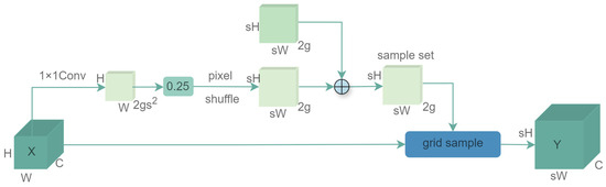 The structure of DySample [37] is shown in Figure 5, different from traditional fixed upsampling methods such as bilinear interpolation, DySample proposes a dynamic, content-aware upsampling scheme. Traditional methods often lead to blurred edges and detail loss due to their fixed averaging mechanism. DySample can adaptively adjust the sampling position according to input feature content by learning adaptive sampling point offsets, thereby more accurately retaining object boundaries and texture details. This adaptive mechanism mitigates the problem of feature space misalignment and information ambiguity caused by traditional methods. It enables the semantic information in low-resolution feature maps to be converted to the high-resolution space with higher fidelity, providing higher-quality feature inputs for subsequent feature fusion and detection tasks. Furthermore, a major advantage of DySample is its lightweight design. It employs an efficient point sampling method to avoid generating large dynamic convolution kernels or complex convolution operations, thus achieving excellent performance with minimal parameters and computational costs.