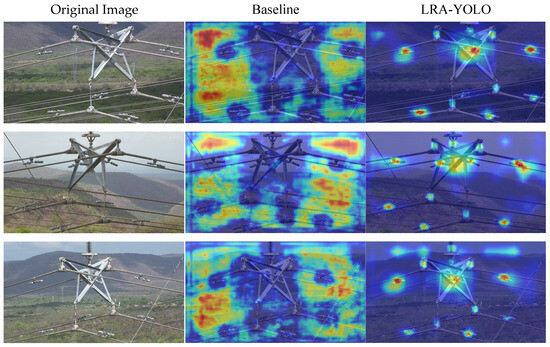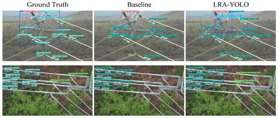 A qualitative visual visualization analysis of the Baseline model and LRA-YOLO was conducted on the insplad dataset. We selected three typical scenes for visualization analysis: a long-distance scale-variable object scene, a tilted view detection scene, and a complex background scene. As shown in Figure 8, the first scene contains multi-category objects of varying sizes, where the baseline model exhibits several missed detections. The second scene is a tilted view, in which objects undergo perspective distortion, that is, the effect of near big and far small. The scales of different positions on the image are inconsistent, and the size and shape of the same object in the image will be different. Our LRA-YOLO enhances the model’s multi-scale detection capability through the designed CrepLK module, which mitigates the missed detection in such multi-scale scene to a certain extent. The third scene involves detection in a complex background, where dense weeds interfere with the object detection task. Our LRA-YOLO refines and modulates the multi-scale features through the designed LEDSF neck, enabling the model can pay more attention to the object rather than the background, enhancing the object detection performance.
