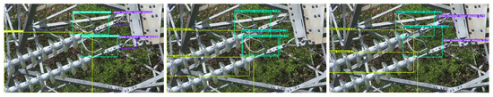 By examining specific error cases, we further discovered that the fundamental causes of these performance bottlenecks lie in object truncation and complex backgrounds in real-world scenarios. These two challenges are precisely what lead to the aforementioned errors in the model’s detection process. As shown in Figure 11, for the first group of close-range object truncation scenarios, the model exhibited three typical errors for the three objects from left to right: the left object had a classification error (Classification Error), which was due to truncation causing highly similar features between different subcategories of the same major category, making it difficult for the model to distinguish them and resulting in low-confidence predictions; The middle object has a localization error, as the identification of certain components (e.g., the polymer insulator lower shackle) depends on contextual information. The truncation disrupts contextual integrity, forcing the model to output a bounding box larger than the ground truth to ensure the object is fully enclosed; The object on the right is completely missed (Missed GT Error) because the object (such as the glass insulator) is severely truncated, and its incomplete visual information does not match the complete object features learned by the model. The same issue caused by object truncation is also evident in the second set of images, where the background at the image boundary is mistakenly identified as the object by the model due to its similarity to some features of the glass insulator big shackle, resulting in background misclassification (Background Error). In the third set of images, the challenge comes from detecting small objects in a complex background. Although our CrepLK module enhances the model’s multi-scale capabilities, the features of small objects such as hanging rings, which occupy a relatively small proportion of pixels, are easily lost after sampling in the deep layers of the network. In addition, the dense trees and intricate steel frame of the tower cause the objects to blend in with the background. these two factors together led to the failure to detect four smaller hanging ring objects.