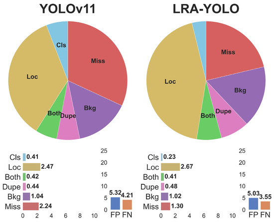 TIDE error decomposition results for YOLOv11 and LRA-YOLO. This figure presents the six main error components analyzed using the TIDE tool for the YOLOv11 and LRA-YOLO models. The specific error types are defined as follows: Classification Error (Cls): The object is correctly located but classified incorrectly. Localization Error (Loc): The object is correctly classified but the localization is inaccurate. Both Classification and Localization Error (Both): The object has both classification and localization errors. Duplicate Detection Error (Dupe): Multiple detection boxes are generated for the same real object. Background Error (Bkg): Background is mistakenly detected as an object. Missed GT Error (Miss): The real object is not detected.