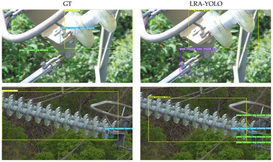 To systematically analyze the failure cases and limitations of the proposed method, we employed the object detection evaluation tool TIDE [42] to conduct error analysis on the Insplad dataset, as shown in Figure 10. This tool decomposes the model’s total error into six fine-grained categories: Classification Error, Localization Error, Both Classification and Localization Error, Duplicate Detection Error, Background Error, and Missed GT Error. It quantifies the impact of each error type by calculating the potential improvement in mAP (ΔAP) after independently eliminating each category of error. It is important to note that TIDE does not sequentially correct errors until the end but instead calculates ΔAP separately for each error category starting from the original model. Overall, our LRA-YOLO achieves significantly lower missed ground truth (Missed GT) errors compared to the baseline model YOLOv11 (1.30 < 2.24). Additionally, TIDE’s analysis results clearly indicate that the performance bottlenecks of our model primarily stem from three types of errors: Localization error, Missed GT Error, and Background Error. If these errors could be ideally eliminated, they could, respectively, contribute to mAP improvements of 2.67%, 1.3%, and 1.02% for the model.