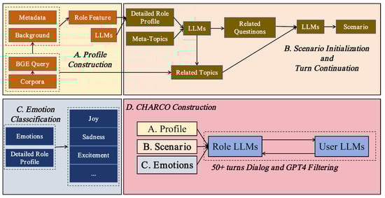 Figure 1 illustrates the construction of CHARCO; the process commences with the creation of persona profiles, which involves the collection of metadata and background information to define role features. These profiles undergo further refinement through the application of language models (LLMs), which facilitate the generation of comprehensive role profiles and the identification of pertinent meta-topics. The subsequent step focuses on initializing the dialogue scenario, where the inquirer’s first utterance is generated, and subsequent turns are driven by related questions, ensuring that the dialogue maintains coherence and context. The integration of emotional dynamics is achieved through the classification of emotions such as joy, sadness, and excitement, which are then linked to role profiles. This linkage serves to shape the emotional tone throughout the conversation. The finalization of the dataset is achieved through the integration of the persona profiles, the scenario, and the emotional components. This results in multi-turn dialogues of over 50 turns, filtered and refined using GPT-4 to ensure high-quality, role-consistent, and emotionally rich interactions, making the dataset ideal for training language models in complex role-playing scenarios.