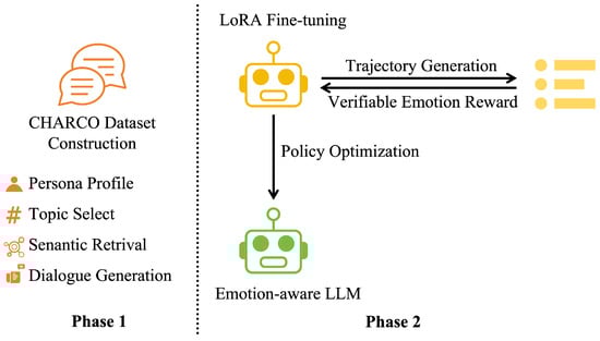 As shown in Figure 2, Phase 1 involves the sequential execution of character profile construction, topic selection, semantic retrieval, and multi-turn dialogue generation, culminating in the creation of the CHARCO dataset. Phase 2 begins with Low-Rank Adaptation (LoRA) fine-tuning of the base large language model (LLM), followed by iterative policy optimization within a closed-loop framework of trajectory sampling and VER, ultimately yielding the final emotion-aware LLM. The LoRA fine-tuned model and the emotion-aware model are represented by yellow and green robot icons, respectively.