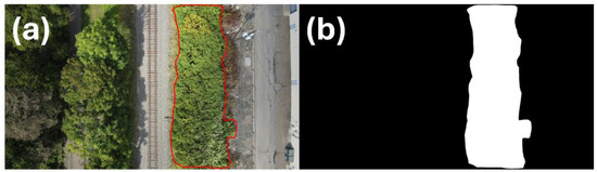 Example of a manually annotated UAV image (a) and its corresponding binary segmentation mask (b). The annotated image shows an expert-labeled Japanese knotweed patch, while the binary mask represents the ground truth used for model training.