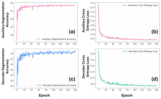 Training dynamics illustrating accuracy and cross-entropy loss for both auxiliary (a,b) and decoder branches (c,d). Auxiliary supervision promotes stable convergence and effective gradient flow throughout training.