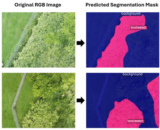 To further assess model performance qualitatively, each example pairs the original RGB image with its corresponding predicted segmentation mask generated by the proposed Twins-SVT + UPerNet architecture. The qualitative assessment demonstrated that the model accurately detected Japanese knotweed (Figure 5).