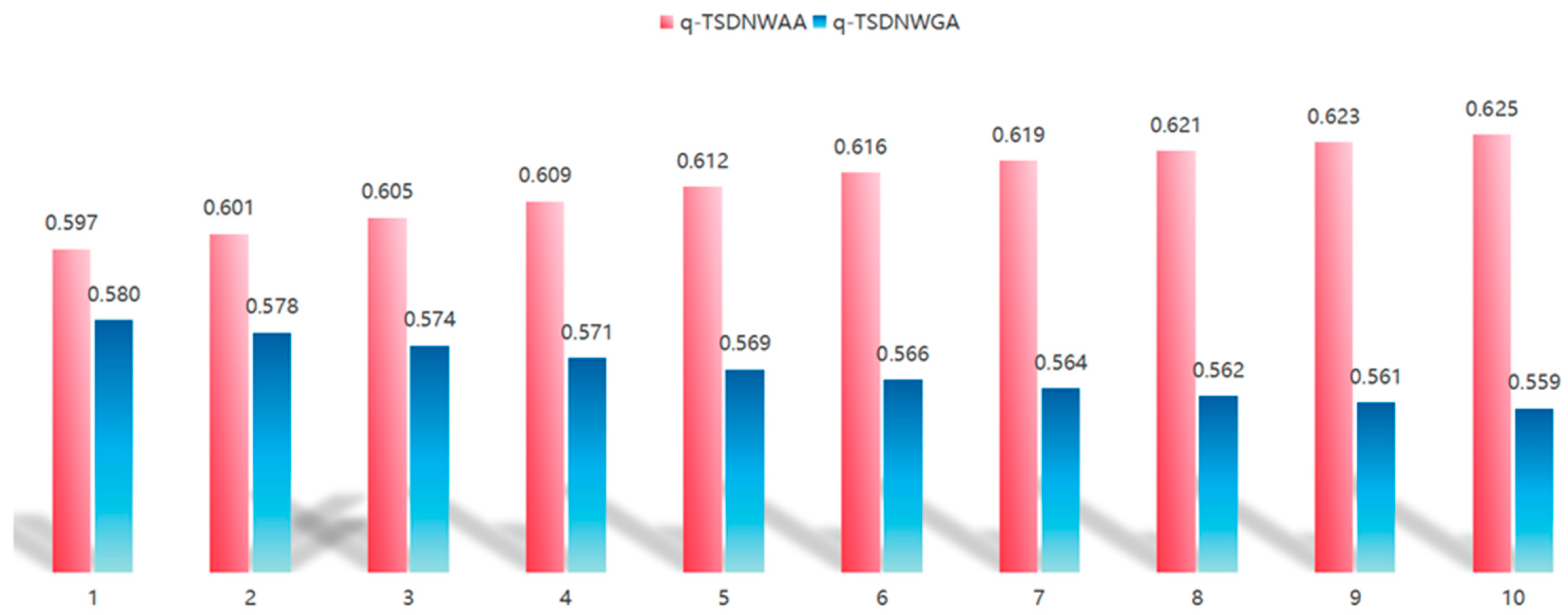 Figure 2, under identical parameters, the aggregated value score derived from the q-TSDNWAA operator significantly differs from that of the q-TSDNWGA operator. Specifically, the q-TSDNWAA operator yields a higher score than the q-TSDNWGA operator. Consequently, during aggregation, optimistic decision-makers may prefer the q-TSDNWAA operator, whereas pessimistic ones may opt for the q-TSDNWGA operator. This divergence stems from their fundamental construction principles: The q-TSDNWAA operator employs an arithmetic mean-based approach, demonstrating strong compensability (where high values in one attribute can offset low values in others). The q-TSDNWGA operator utilizes a geometric mean-based approach, emphasizing synergistic effects among attributes.