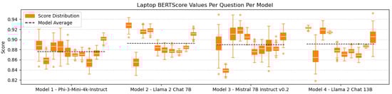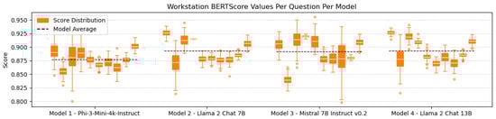 Statistical comparison of workstation BERTScore metrics. For each model ten boxplots are generated, representing questions 1–10 with question 1 on the left side. Each horizontal dashed line shows the mean of means for each model across questions 1–10.