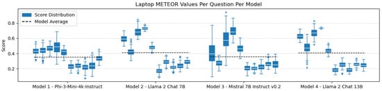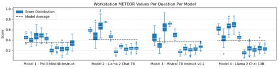 Figure 4 displays the METEOR scores for each model on the laptop, separated into direct question answering (Q1–5) and summarization tasks (Q6–10). Models 2 and 4 (LLaMA 2 Chat 7B and 13B) achieved the highest overall averages, while Models 1 and 3 scored lower. For Model 1 (Phi-3-Mini), all five direct QA scores were above the model average, and all five summarization scores were below it. The results were relatively consistent, with only one direct QA and one summarization showing noticeable variability. Models 2 and 4 followed a similar pattern, with all direct QA scores above average and all summarization scores below, though each showed slightly wider variation on one or two factual prompts. Model 3 (Mistral 7B) also demonstrated this trend: four of five direct QA scores were above the model average, one was slightly above or below, and all summarization scores were below the average. Variability was more pronounced in the direct QA results, while summarization scores were generally lower and more consistent. These results are consistent with the workstation findings and further support the observation that METEOR favors structured, fact-based outputs and tends to under-represent the semantic quality of longer, generative summaries.