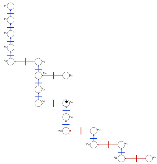 - Reachability-based reformulation—the conjecture becomes a reachability property: place is reachable from any , enabling the use of established Petri net reachability theory.