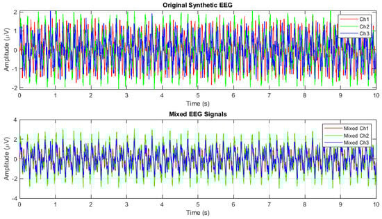 Three frequency components are designed to simulate brain rhythms: a 10 Hz alpha wave (), a 20 Hz beta wave (), and a 6 Hz theta wave (). These components are linearly combined across channels to simulate temporal mixtures: