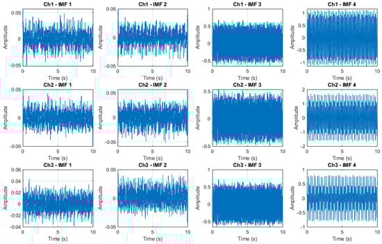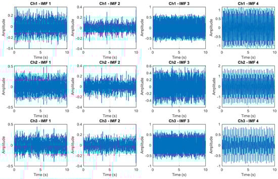 In Figure 6 is shown the predicted IMFs decomposition (first four of a total of IMFs) based on an LSTM surrogate of the MEMD for the signals shown in Figure 3.